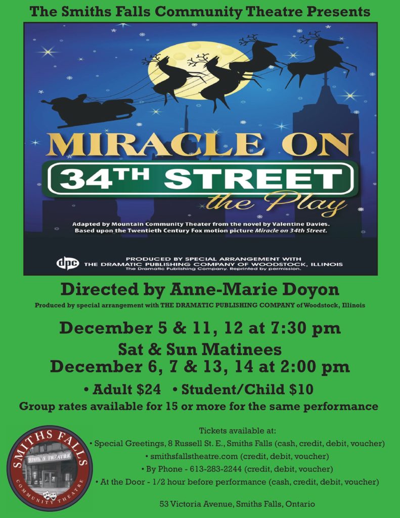 Home Welcome to The Smiths Falls Station Theatre MIRACLE ON 34th STREET Learn More Buy Tickets FNI MOVIE – Oct 30 Learn More NOVEMBER 1 Learn More Buy Tickets November 1 Learn More / Buy Tickets November 8 Learn More / Buy Tickets MOVIE – Nov 14 & 15 Learn More RED DIRT SKINNERS Learn More Buy Tickets