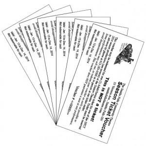 VOUCHER HOLDERS ONLY One voucher is equivalent to one ticket – regardless of ticket type.To redeem prepaid vouchersSelect “Pick Your Seats”Proceed to checkoutEnter the coupon code “voucher25” and click Apply. This will set the order to zero.Turn over the appropriate number of vouchers at the door when you attend the play.If you do not wish to use a voucher for some of the tickets, do not include them in the order using the voucher coupon code. Create a separate order for those specific tickets.